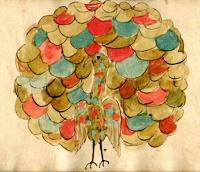 Ann's sketchbook is small, only about 8" x 5" and made from fifteen sheets of paper. While it was purchased commercially, over time she tore some pages out, and added another. She drew in pencil and in ink, and added color with watercolor paints purchased from Philadelphia shops. The early pages of the book are filled with the kind of brightly colored, fanciful birds popular in 18thc embroidery, including a stupendous peacock, middle left, plus a rabbit, and a cat. Ann was a skilled needleworker, and it's possible she was experimenting with new designs or archiving older ones. There are also designs for flowers, vases, and animals.