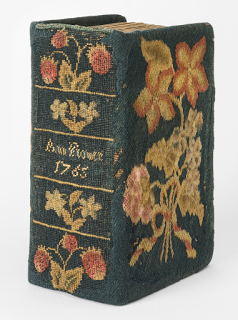 Below: Embroidered Book Cover, by Ann Flower, wool and silk on linen, c1765. Winterthur Museum.