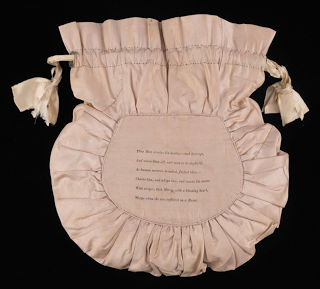 Today (especially during this election year) people wear a printed t-shirt to display their political allegiances and concerns to the world. In the 19thc, the abolition of slavery was an important and emotional social movement, and abolitionists found many ways to show their support their cause. Abolitionist motifs and slogans appeared on everything from jewelry to porcelain to printed scarves, handkerchiefs, and workbags like this one, newly acquired for the Art Museums of Colonial Williamsburg.