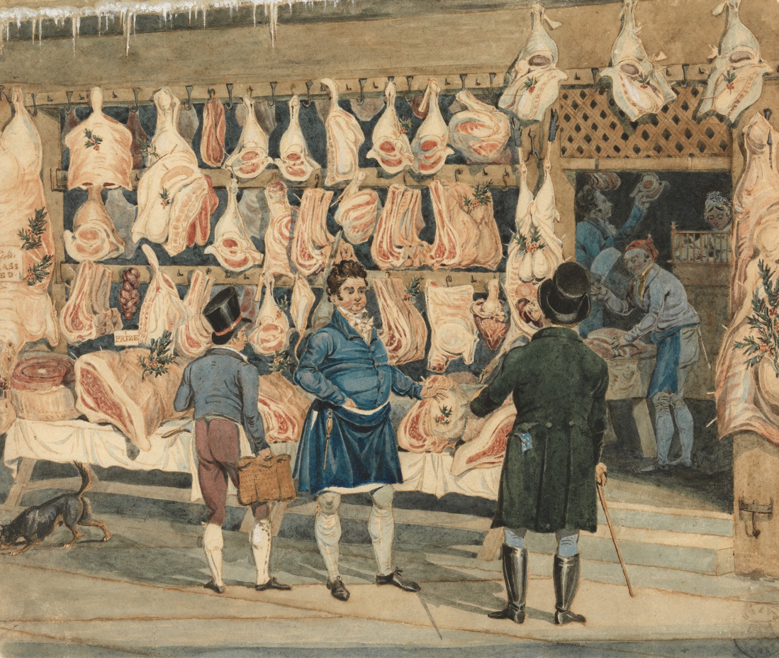Image above, from Ackermann's Repository, courtesy Philadelphia Museum of Art via Internet Archive. Image below, James Pollard, The Meat Market , courtesy Yale Center for British Art, Paul Mellon Collection.