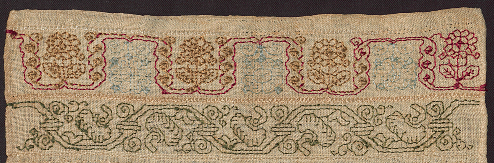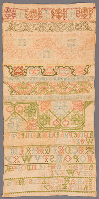 The stitches and patterns are traditional designs that, once learned, could be employed in different ways. Letters and numbers would have been used to mark linens, shifts, and shirts, while the floral designs could embellish both clothing and household linens. Most of the sampler is worked in cross stitch, although there are some more linear stitches used as well. (Compare these geometrically-inspired designs with the more free-flowing flowers of the needle lace sampler I posted earlier from the 1790s.) Though faded with time, the colors would once have been rich and vibrant, and their selection would have been an integral part of Sarah's creation.