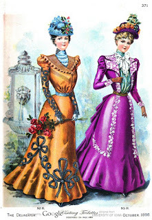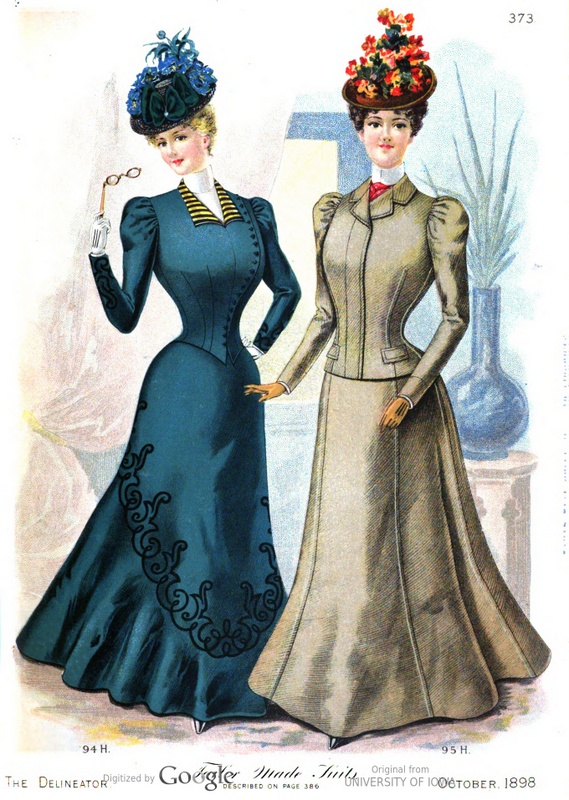 It appears that 1898 continued a change in fashion begun in 1897, when the huge leg o’ mutton sleeves disappeared, along with clashing colors. C. C. Willett Cunnington, in English Women’s Clothing in the Nineteenth Century tells us: