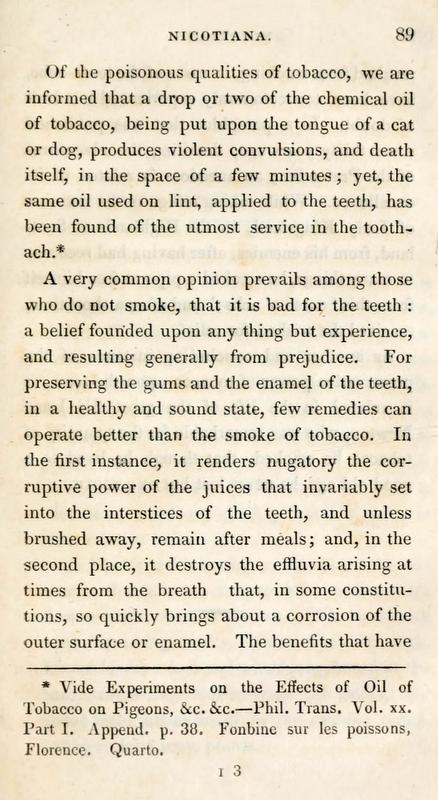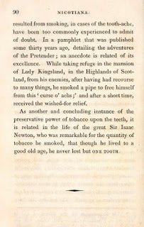 Henry James Meller's Nicotiana (1832), whose full title is almost as long as one of its chapters, is very much a pro-tobacco document. However, it’s also an interesting historical one. I chose one from hundreds of possible excerpts, mainly because this isn’t the only 1800s book I've found recommending tobacco as a preservative for teeth.