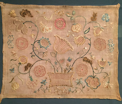 The identity of this sampler's maker is now sadly lost beyond her initials, but her exquisite workmanship remains. Worked in a school in the Philadelphia area, the sampler features both traditional embroidery stitches and needle lace to create a stylized basket of flowers, a motif popular with embroiderers in many different cultures. The sampler is worked in silk thread on linen. (As always, please click on the images to enlarge them.)