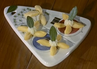 I wonder how many of these food ideas traveled from Britain to the U.S. or vice versa. I also wonder how many of us dress to cook in the style of the woman in the first segment. But I do lust for her jewelry. And her dress. And the mid-century dishware.