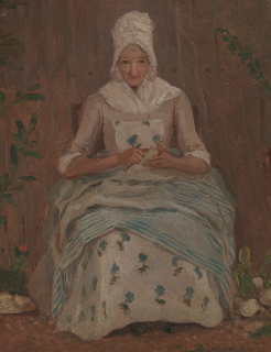 But all that speculation aside, there's a wealth of details in the clothing of the four women. The oldest woman, upper left, sitting by herself and warily looking up at the artist, is dressed in the style of an earlier generation, in a plain gown, kerchief and ruffled cap. She's also wearing a floral-printed pinner apron, something I can't recall seeing before (Has anyone else out there seen one in a collection or in another painting?) Instead of needlework, it appears that she's peeling white turnips with a plate of peeled ones on the ground beside her, and more turnips with the leaves still attached to her left.