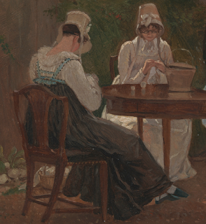 Since my last two posts have featured an 18thc sampler and another worked in 1673, it's not surprising that embroidery and sewing have been in my thoughts lately. When I came across this charming painting with women sewing in a London garden, I knew I had to share it here. As always, please click on the images to enlarge them.