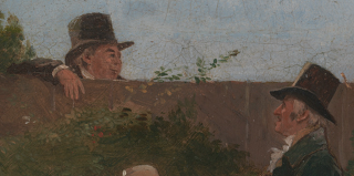 It's an informal painting, the kind of picture that artists make as gifts for friends or for their own amusement, and small (only about 5" x 7".) Even though the specific identities of the people have been forgotten, they definitely have the look of a family at ease with one another. The women are engaged with their work, while the men talk over the wall. Though there's no documentation, I wouldn't be surprised if the man leaning over the fence was Agasse himself, bottom left.