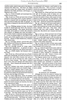 The fashions of the ‘80’s were more remote than those of any other decade from modern standards of taste. But if, on that account, we are pleased to call them ugly we only beg the question—not very important—which is the better taste. Their interest to us lies in their significance for they display an unusual amount of symbolism. Economic depression forcing many women to seek other careers than marriage, couple with increasing outdoor activities, produced fashions in which the ordinary devices of sex-attraction were absent. The tailor-made costume, for example, seemed to the older school repellently masculine. It was the first move towards a style signifying (unconsciously) that the wearer was engaged in some other pursuit than the capture of man. Even the evening dress, majestically ornate, avoided the cruder methods of allurement; the high neck for dinner wear, the minimum display of physical charms until eh close of the decade, and the preference for heavy materials, all were in keeping with the spirit of the period. The principle was strict, that beauty should make no passionate appeal. The epoch was, above all others, anti-anatomical.”