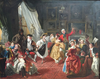 A Game of Charades, above (click on the image to enlarge), was painted by the popular historical and genre artist Edward Matthew Ward. A lively family group is amusing itself with charades in the parlor, and the improvised costumes include a sailor, some sort of rough frontiersman, and a gypsy. Of course there's a guy in drag, too, with a cap and kerchief on his head, because there always is.