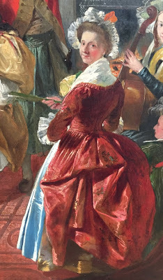 But it's the woman in the painting's foreground (and right) who really breaks my heart. She's wearing a gorgeous gown, petticoat, and apron from around 1775, complete with a ruffled cap that she likely found in the same trunk. The pale blue silk in that apron shimmers richly, and the petticoat that peeks out from beneath the gown looks like it might have gold threads. The rose silk of the gown is either a damask weave, or perhaps embroidered with flowers. This is still-beautiful clothing that must have been the height of fashion when new, and costly, too, yet by 1840 it's been relegated to charades, or perhaps to the artist's costume collection. What became of it all since then, I wonder?