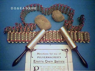Maybe I overlooked it elsewhere, but, among other things, I discovered that Dickens’s health was worse than I'd supposed, and he suffered from gout (which he pretended was something else—there was a lot of fiction in his life as well as his books). And to treat his painful foot, on the night before he died, he ordered “a ‘voltaic band,’ a type of electric chain that had become a fashionable all-purpose cure, recommended to him by the actress Mrs. Bancroft and supplied by Isaac Pulvermacher, Medical Battery Maker.”