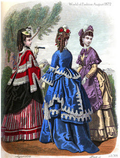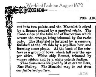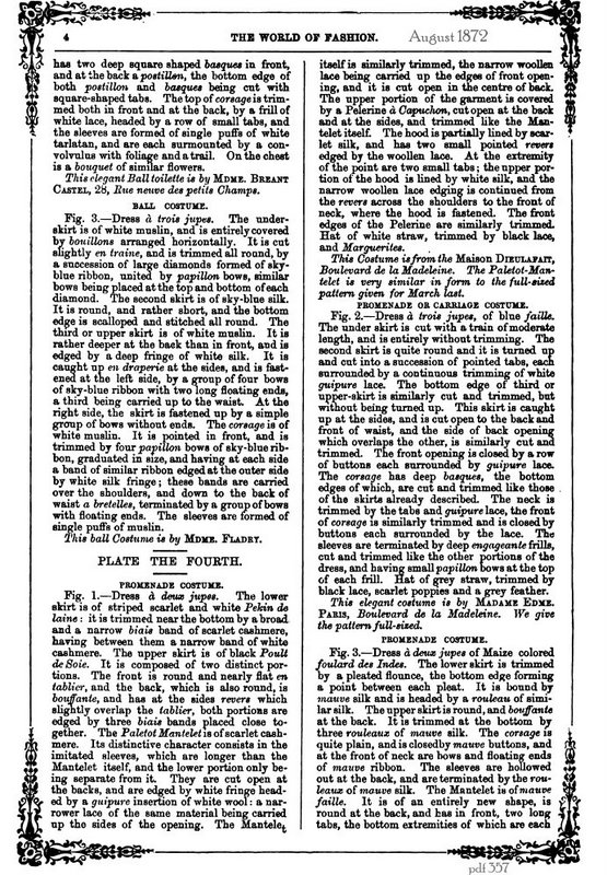 Cunnington includes more detailed explanations of the style(s). Since I do not make historical clothing and barely understand even modern dressmaking terminology, these might as well have been written in Romanian or Chinese. What’s clear enough is the change in shape from the 1860s fashions I showed last month , from the wide-all-around tent-like skirt to the flat front, and the wonderfully inventive emphasis on the booty.