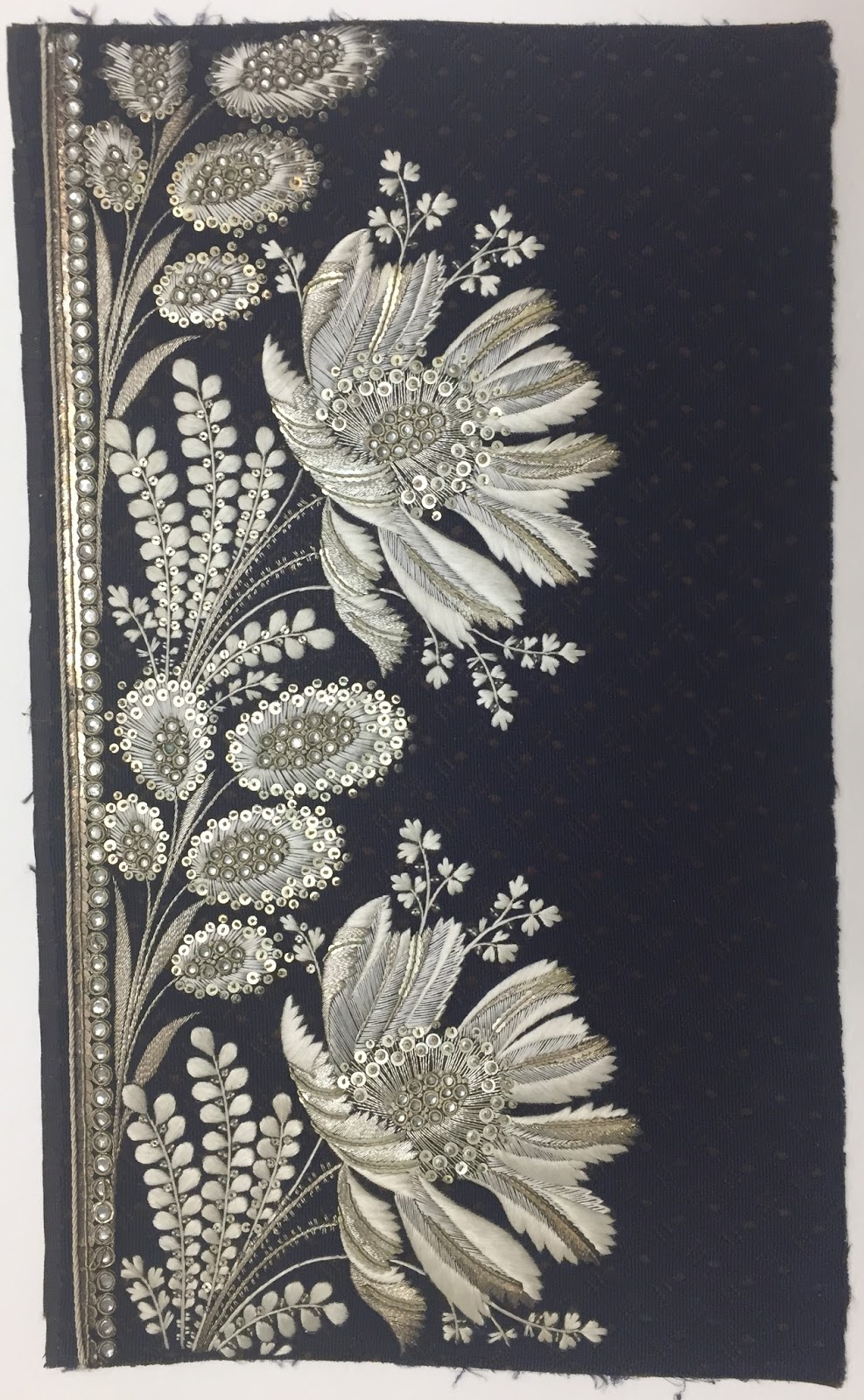 Worked in shades of silver with gold accents on that inky velvet, a suit enhanced with the design in this sample would have sparkled and gleamed in an elegant, refined show of wealth and taste. Equipped with a magnifying glass, I was able to see the exquisite delicacy of the stitches, and the extremely fine silk and metallic threads used to create them, threads that would likely be impossible to find today.