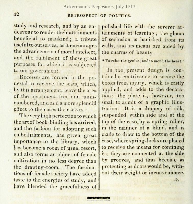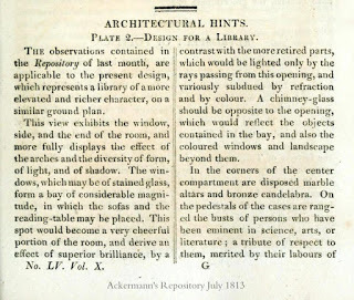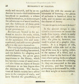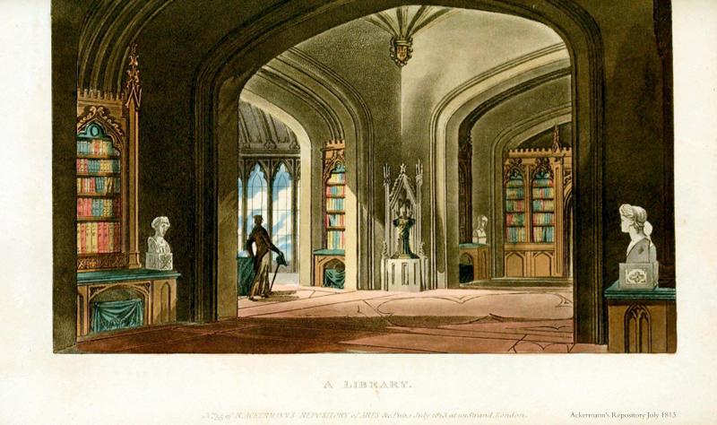 I tend to set many scenes in libraries, for all kinds of reasons. Libraries in great houses can be cozy or vast. By the Regency, and certainly by the time of my stories, people are spending more time in them, reading, looking at maps, drawing, writing letters, or simply using it as a family den—“a room of usual resort” as the description puts it. In my searches online, I’ve found libraries of all shapes and sizes. They might contain a greater variety of furniture than other rooms. And then, I like the idea of surrounding my characters with books.