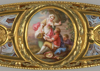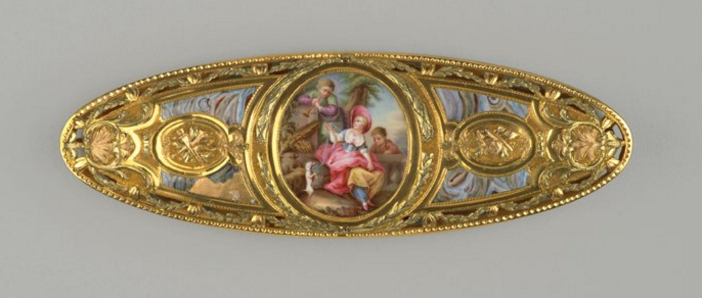 Elegantly industrious displays in the drawing room required decorative tools, too. I spotted this 18thc knotting shuttle, top and right, last week on Twitter, and it's a beauty. Knotting shuttles were often made of expensive materials such as tortoiseshell, crystal, mother-of-pearl, and silver. This one must have been top-of-the-line, for it's gold. Delicate enamel work adds further embellishment, with a rural scene as well as simulated stone inlay, detail lower left. This shuttle falls into the same category of luxurious small-goods pretending to be useful such as jeweled snuffboxes, gold boxes for rouge, and enameled nécessaires - costly little indulgences that the skilled tradespeople of 18thc Paris were so talented at creating.
