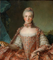 Knotting was favored by aristocratic ladies of the French court, such as Madame Adélaïde, above left, the daughter of Louis XV and Marie Leszczynska. (As always, please click on the image to enlarge it.) The thread was knotted at close intervals to create a decorative braid that could then be stitched onto clothing or other items. Silk thread or cord was wrapped around a shuttle, and unwound as needed.As handwork and needlework go, it's not complicated.