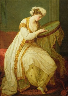 Although the origins of tambour embroidery are a bit hazy, it appeared in Europe in the 18th c. and quickly became a popular "accomplishment" for ladies. It was considered exotic stitchery, which contributed to its popularity, and many of the finest commercial examples were imported to Britain and France from India and Persia. The rather fanciful portrait of an 18th c. Turkish lady (or more likely a French lady in Turkish dress), left, shows her working tambour embroidery on a large hoop tambour frame.