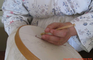 There is only one stitch to master in tambour embroidery. Instead of a needle, very fine, sharp hook is punched through a tightly stretched fabric to catch a fine thread from beneath and draw it up, creating a linked, chain-like stitch. The name "tambour work" comes from the way the fabric is held taut between two round, fitted hoops, resembling the head of a small drum, or tambour. (Demonstrating tambour work, below left, is our friend Janea Whitacre, mantua-maker from Colonial Williamsburg .)