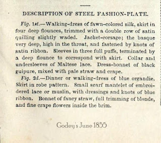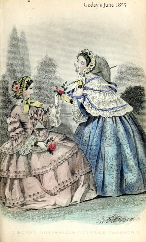 This month we move into mid-19th century, where the skirts seem to be belling out more widely. Since Victorian fashion is foreign territory to me, I'm at a loss for intelligent observations, let alone clever ones about these steel engravings from Godey's' Lady's Book for 1855. I do love the flowers and lace framing the ladies' faces, under hat brims.