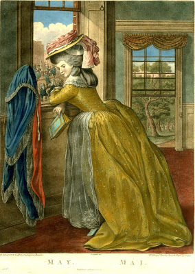 This print, right, would've made a perfect example. Pretty young women seem to have always been used to illustrate the calendar months, and this lady coyly glancing over her shoulder represents May, 1781. She's one of a set of twelve prints that could have been purchased together or individually. Hand-colored prints like this were increasingly popular in the 18thc, whether framed or simply pinned to the wall, where they added a touch of fashionable gentility in homes and businesses that couldn't necessarily afford paintings.