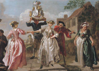 Right: Detail, The Milkmaid's Garland, or the Humours of May Day, by Francis Hayman, 1741-1742, Victoria & Albert Museum.