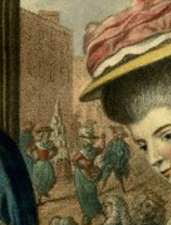 So what about her appearance and attire is a faithful representation of women's dress in 1781, and what's exaggerated? It's safe to say that her tiny little foot in its tiny little shoe wasn't really that tiny; surviving shoes from the period prove that English women's feet were in proportion to the rest of them. Her dramatic hairstyle was accurate (see our earlier posts here and here on 18thc big hair), but to make her hair and hat more stylishly impressive by comparison, the artist seems to have shrunk her face. And that ample posterior? That, perhaps surprisingly, is accurate, and would have been achieved with the help of a false bum or rump - pillow-like enhancements that were tied around the waist to support the skirts and give a come-hither wiggle to the walk. (See more about false bums here.)