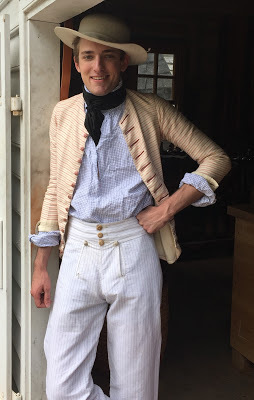 It was hot and humid today in Williamsburg, and Ike shows how an 18thc Virginian would have dressed for the summer weather while keeping an eye on London fashion. He's wearing loose, lightweight striped trousers, a checked linen shirt, and a black silk neckerchief. His striped jacket is a light wool and worn open (see the same jacket here worn buttoned for a very different look.) The final jaunty touch: a white felted wool hat, the summer version of the ubiquitous black hat worn by most 18thc Englishmen.