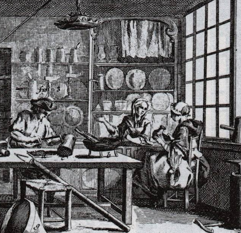 Finding Jenny working in an 18thc tin shop isn't a 21stc equal-opportunity anachronism. Diderot's famous Encyclopédie, published between 1751-1772, showed women workers in the plate on tin making: "Metallurgie, fer blanc": (detail, lower right). There are documented examples of women tinsmiths in 18thc Britain, France, and colonial America, including a daughter continuing her mother's trade in South Carolina.