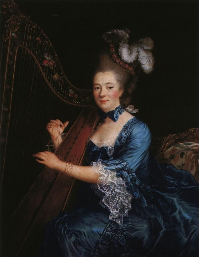 In 1761, the two sisters had their portraits painted by François Hubert Drouais (1727-1775), an artist who specialized in beautiful portraits of beautiful women; among his sitters was Louis XV's mistress Madame du Pompadour. The sisters were painted in rich settings, wearing lavish silk gowns with costly lace. To indicate their musical talents, Marie is holding sheet music, while Geneviève is shown gracefully playing her harp. They were also originally painted with the hairstyles of 1760, which were tightly curled and close to the head, much like another lady that Drouais painted around the same time, below left.