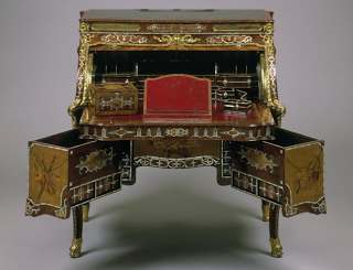 The front of the desk has an elegant monogram of inlaid mother-of-pearl with an intertwined "MA" that was long believed to belong to Marie Antoinette, Queen of France. But according to the web site of Hillwood Museum, which now owns the desk, the letters more likely belong to another noteworthy lady of the 18thc, Maria Antonia, Princess of Bavaria and the Electress of Saxony.