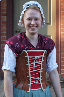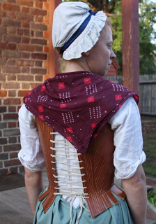 Last fall I shared a post about the replica leather stays that were being made at Colonial Williamsburg . Following historical examples, the stays were made by leather-workers Jay Howlett and intern Emma Cross for two of CW's apprentices: blacksmith Aislinn Lewis and tinsmith Jenny Lynn. When I wrote more about Jenny's 18thc clothing on Monday, reader Adam Cyphers asked if there was an update on how the leather stays were working "in the field."