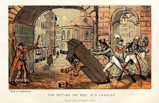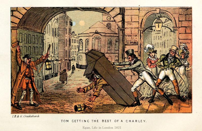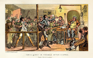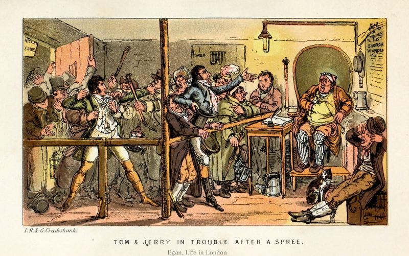 After [a young forger] were brought up three young sparks for a street row. They had been enacting the parts of Tom, Jerry, and Logic, and the scene had ended, as usual, in the watchhouse. One of them exhibited the marks of the prowess of the "Charlies" in a eye portentously swollen and blackened. The two others seemed to have undergone complete immersion in the kennel; the mud of which, being now dried on their clothes, gave their evening finery a most dilapidated aspect. It appeared that these young men had been vastly taken with the refined humour, brilliant wit, and gentlemanly knowledge of the world in the production called " Life in London;" and that they had determined to emulate the deeds of its triumvirate of worthies as soon as opportunity served. In pursuance of this exalted ambition, they had sallied forth the night before with the determination of having " a spree." Accordingly, in the Strand, they had overtaken a watchman, a feeble old man, who was instantly, in the most manly manner, floored by a broad-shouldered young fellow of six feet high. The prostrate Charley, however, incontinently sprang his rattle, which brought to his assistance a sufficient number of his brethren to lodge, after a desperate resistance, the Corinthian and his friends in the watch-house. And here it appeared that their-behaviour was by no means peaceable and resigned; indeed, the constable averred, that be was finally necessitated to consign them to the strong room for safety.Tom & Jerry In Trouble After a Spree