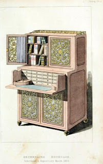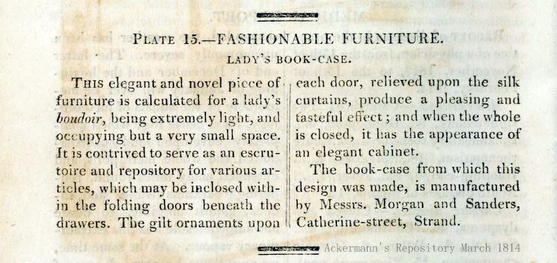 Morgan & Sanders, of Nos. 16 & 17 Catherine Street, Strand, London, made and sold patent furniture that was often featured in Ackermann’s Repository. The globe desk I showed last month is an example.