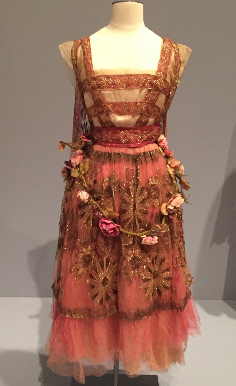 Not even twenty years separate the navy dress from my second favorite, but fashion changed dramatically in that time. Gone is the ground-skimming hem and corset-defined shape The dress, right, is a 1916 evening dress by the famous Parisian design house of Callot Soeurs, and it's as insubstantial as a summer breeze.