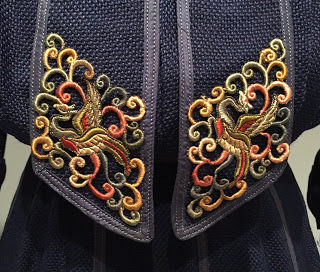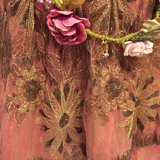 Made of silk satin and net, and trimmed with metallic embroidery, velvet trim, and millinery flowers, the colors are still fresh and vibrant. There are two long streamers from the back shoulders, and those, combined with the airy full skirt, must have been made for the latest foxtrot. But although the colors are still fresh and bright - I'd bet there are plenty of high school girls today who'd love to wear this dress to their proms - the dress itself is so fragile that this will likely be its one and only time on display. Like Cinderella herself, this dress will have this final time beneath the lights to sparkle, and then back it will go into careful storage.