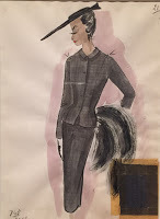 In addition to some truly exception clothes made by some of the biggest names in modern fashion history - Dior, Chanel, Halston, Callot Soeurs, Gallanos, Oscar de la Renta, Adrian – the exhibition also includes a selection of fashion drawings from the 1920s-1950s. These stylish sketches, (like the one middle left) some with fabric swatches attached, helped wealthy customers decide what to order from designers in those days before everyone had an iPhone aimed at the runway.