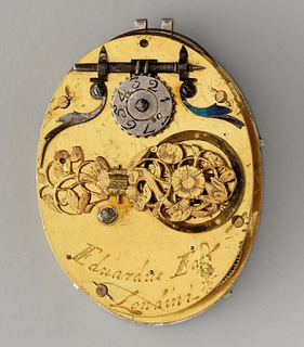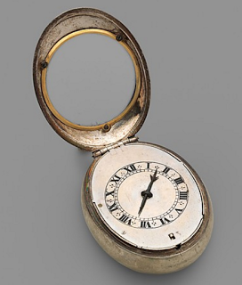 Note that the watch has only a single hand, for marking the hour. The second, minute hand didn't come into use until later in the 17thc, when the accuracy of watches had increased sufficiently to merit it. This watch could have run as long as sixteen hours from a single winding, although in the course of that time, it could also be as much as several hours wrong. But for its day, it was a marvel. Just ask Samuel Pepys.