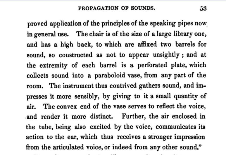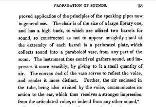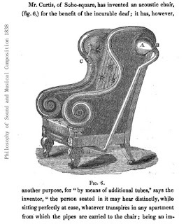 “Mr. Curtis, about 1830, by the aid of several mechanics, brought out his acoustic chair, which was stated to possess such wondrous power, that His Majesty could sit in his palace, at Windsor, and hear communications from his ministers at Whitehall. Whether our present Sovereign does not require her ministers to keep at such a distance, and, therefore, has not patronized Mr. Curtis's acoustic chair, or whatever other cause may have operated, probably will never be known, but that gentleman's name does not appear to be continued in the list of Her Majesty's household.”— William Wright, A Few Minutes' Advice to Deaf Persons (1839)