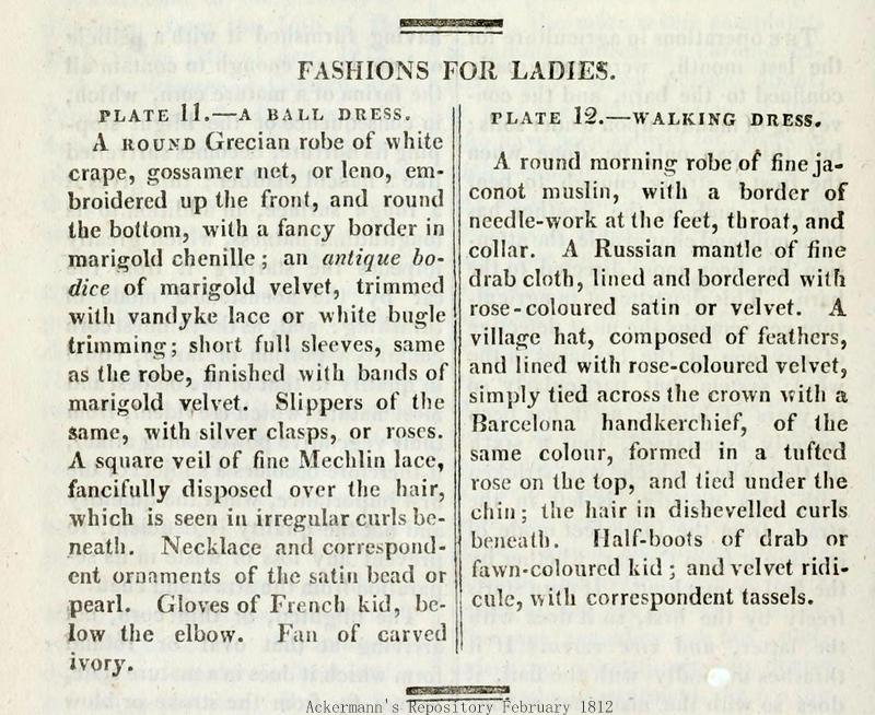 These two dresses, though, fall smack dab into the Prince Regent’s time, with the classic vertical muslin styles we associate with Pride and Prejudice , and which happen to be illustrated in especially beautiful prints in Ackermann’s Repository.