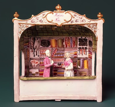 This little shop was made in the Ludwigsburg Porcelain Manufactory, c1765. Apparently the shop was part of a much more elaborate market scene, composed of numerous porcelain shops and figures, and commissioned by Charles Eugene, Duke of Wüttemberg (1728-1793). Apparently the set was inspired by the Duke's visit to Venice, and was used as a table centerpiece for banquets.