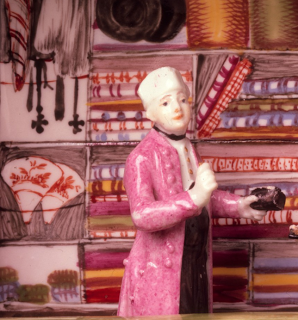 All of which is why I found this little (only about six inches high) porcelain so delightful. According to the sign on the front, it shows a marchand de mode, or fashion merchant, complete with a well-dressed shopkeeper ready to serve his customers. I'm not quite sure if the woman represents a customer, or a shop assistant; while the man is firmly behind the counter, her body ends vaguely right on top of it.