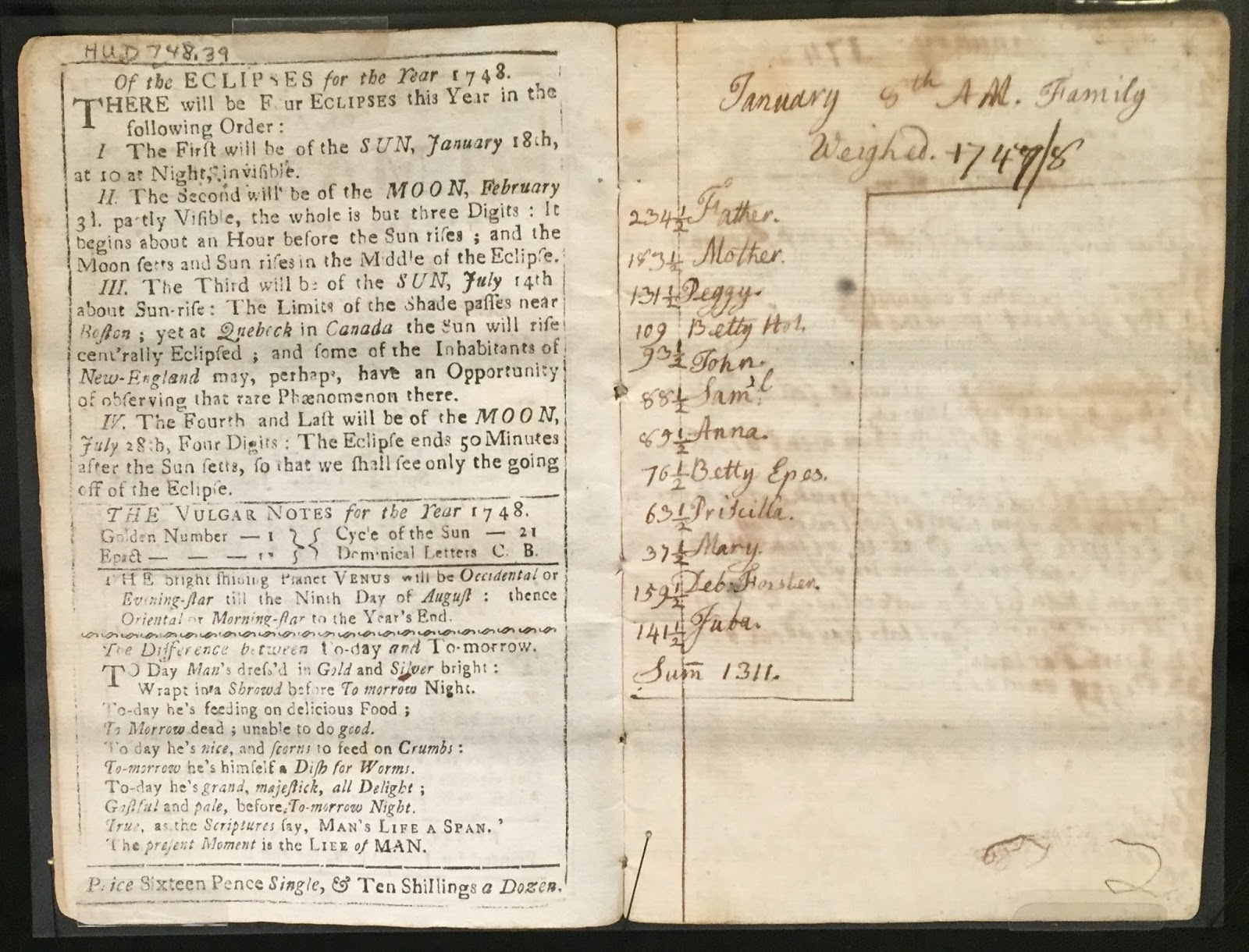 But apparently this isn't anything new. In 1748, a young man noted the results of his family's January weigh-in. Born in Marblehead, Massachusetts, John Holyoke (1734-1753) was the son of Edward Holyoke, who became the ninth president of Harvard College in 1737 and moved his family to Cambridge, outside of Boston. Fifteen-year-old John kept an informal diary on the interleaved pages of his copy of An astronomical diary, or, An almanack for the year of our Lord Christ, 1748 by Nathaniel Ames. On these pages, John wrote of the things that interested him: the weather, family illnesses, and his own studies, travels, and daily activities