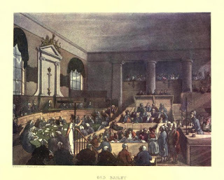 The color image above of an Old Bailey trial is a couple of decades before the time of the story, but according to the website, the “basic design of the courtroom remained the same.”