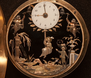 This is a very short video - less than a minute - but it's still an impressive tribute to the level of craftsmanship of 18thc. jewelers and watchmakers. Made of gold with enamel, the watch's artistic detail is as stunning as the clockwork mechanism that animates it. Alas, both the maker and the original owner's name are now forgotten, and today the watch is most famous for having been in the collection of King Farouk of Egypt during the 20thc.