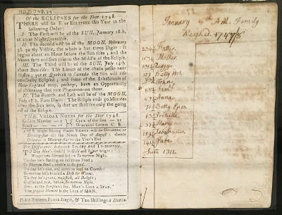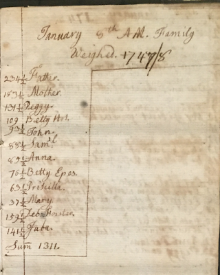 Opposite a list of the year's eclipses, above, John made his first note for the new year, titled "January 8 AM. Family Weighed 1747/8." (Detail below right; click to enlarge.) In the days before personal scales, weighing oneself meant going to a commercial establishment and using the same scales employed for weighing goods and produce. This wasn't merely a colonial hardship; in faraway London, even dukes presented themselves to be weighed on the commercial scales of Berry Brothers & Rudd . Apparently John's father must have taken his entire extended household to one such set of scales to start the year, and John wrote down the results.