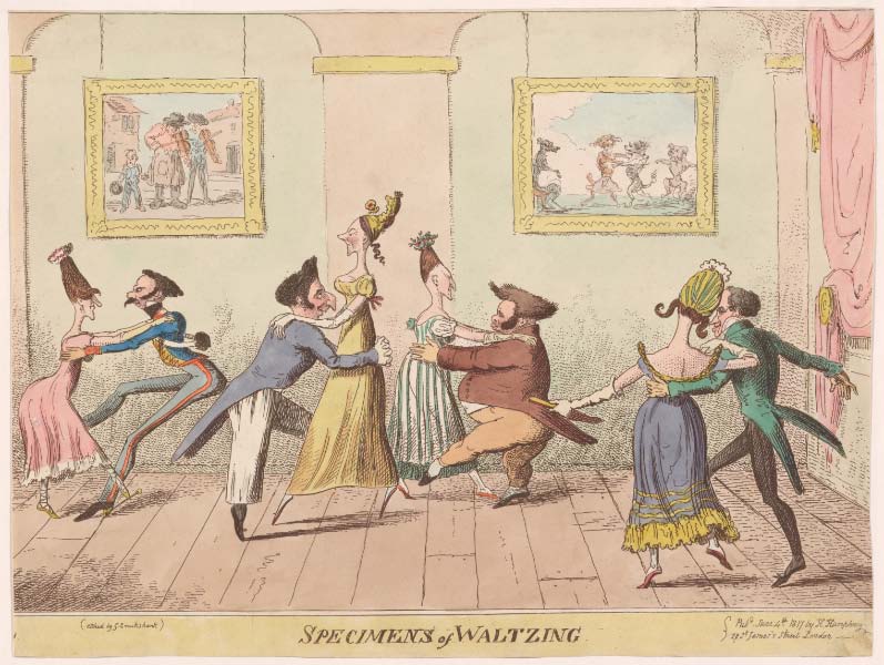 Images: Waltzing 1821, courtesy Lewis Walpole Library Digital Collection; Detail from frontispiece to Thomas Wilson's Correct Method of German and French Waltzing (1816), showing nine positions of the Waltz , via Wikipedia; Specimens of Waltzing , George Cruikshank, 1817-06-04, courtesy New York Public Library.