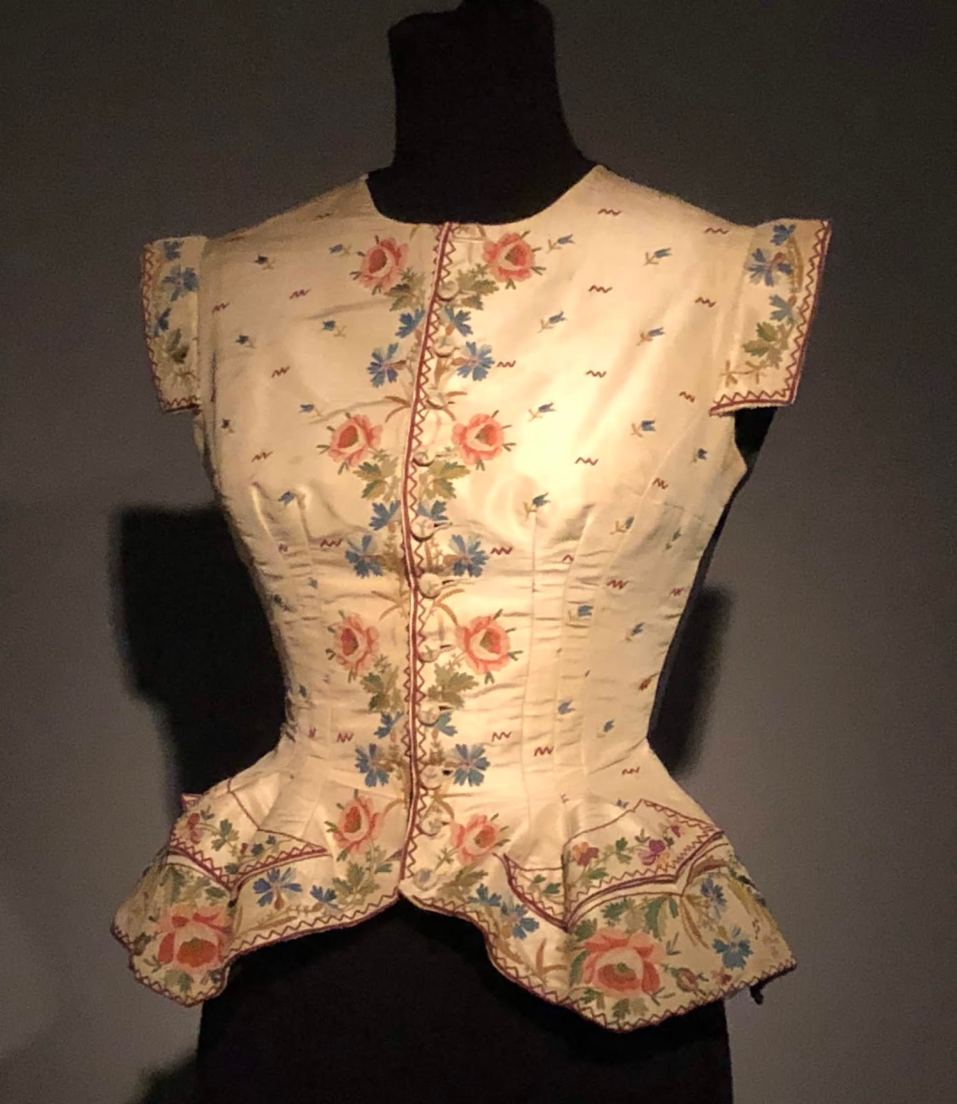 Left: Woman's Vest, remodeled c1950 in America, from an 18thc man's waistcoat. Museum at FIT. Photograph ©2018 Susan Holloway Scott.