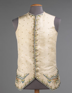The clothing of 18thc gentlemen, while just as lavish as that worn by the ladies, seldom received the same treatment. This is not only because the men's coats, waistcoats, and breeches were fitted and tailored, providing little fabric for a new project, but also because after 1800 or so, men's clothing took a decidedly more somber turn. There was little interest among men in the 19thc or 20thc to refurbish a spangled pink velvet court suit (except, perhaps, by Liberace.)