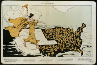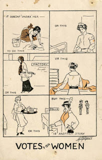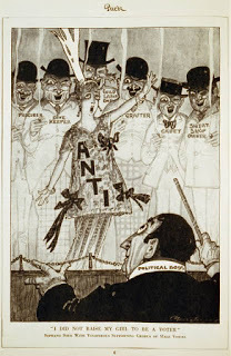 We all know the suffragists were ridiculed and abused all the way to the ballot box, but you might want to look at samples of what some people found hilarious, here (let's also ridicule women's fashion while we're at it), here , here , here , here , and here . Note that suffragists are always unattractive, sometimes monstrous. Elderly spinsters appear frequently. Wearing eyeglasses.